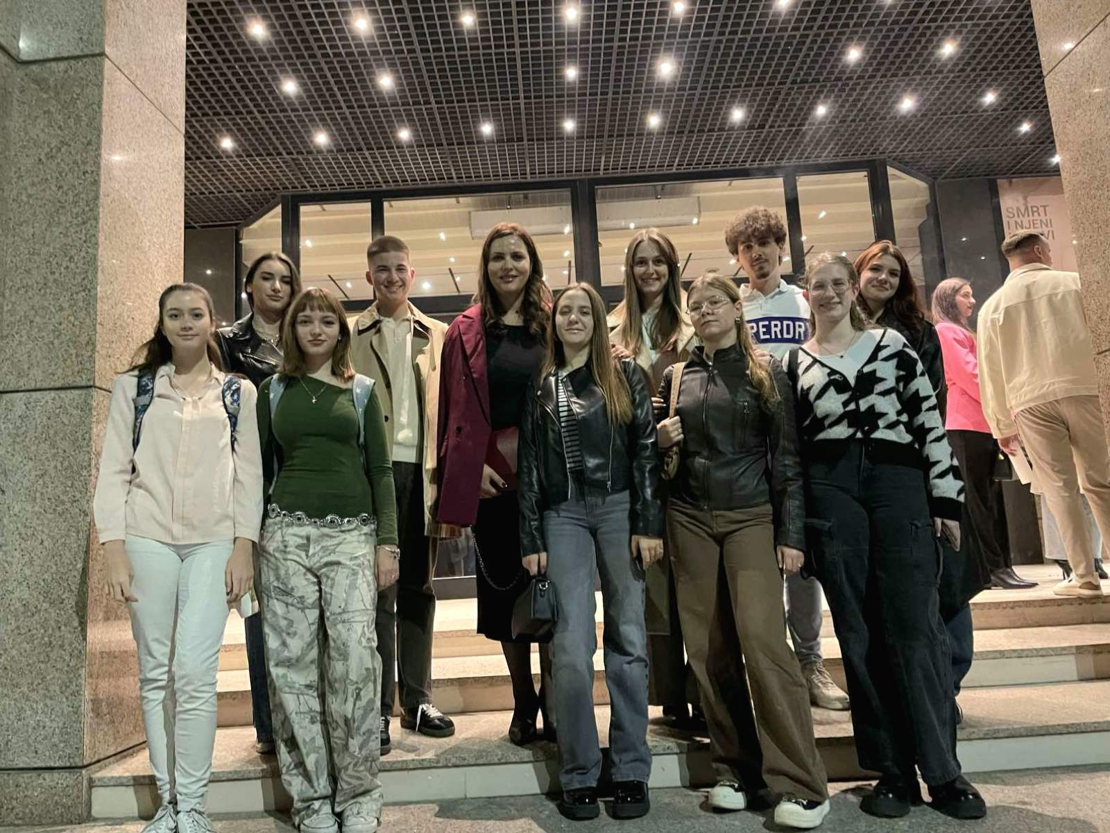 У петак, 24. октобра, чланови Драмске секције наше школе, са професорицама Светланом Поповић и Јеленом Војиновић Ћалић, имали су прилику да погледају представу „Вернисаж“, која је изведена на Великој сцени Црногорског народног позоришта (ЦНП).