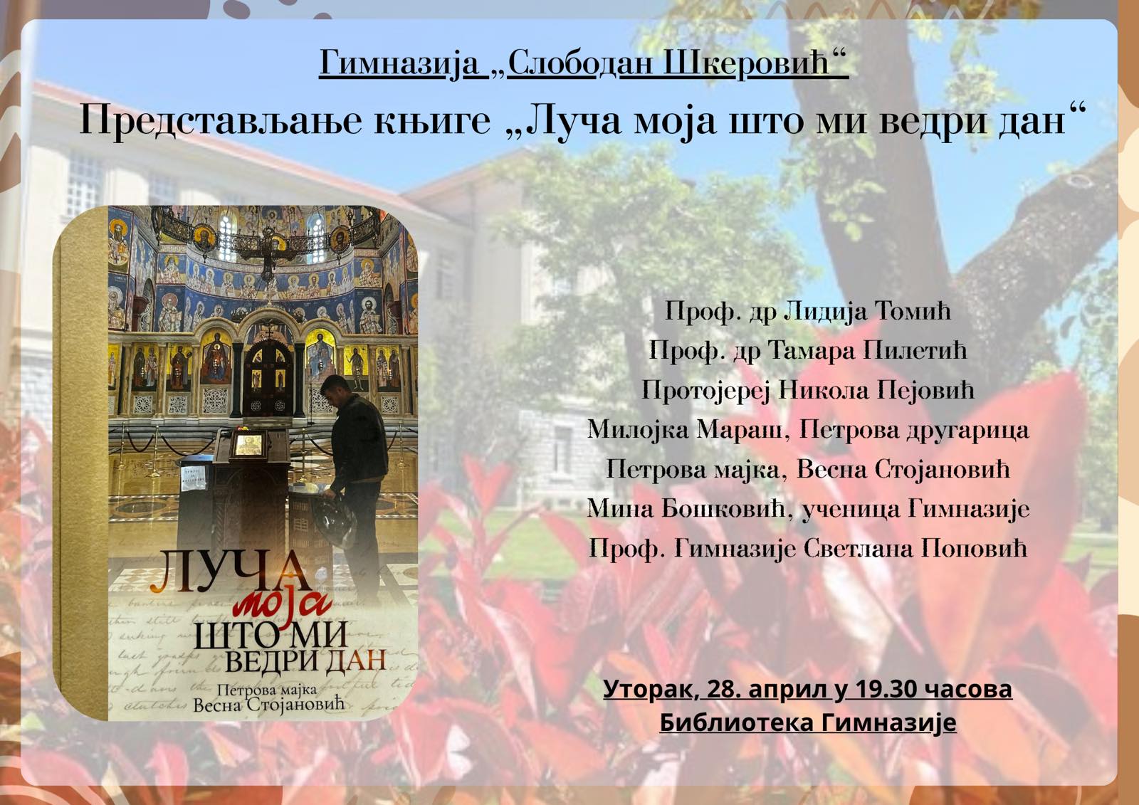 ЈУ Гимназија „Слободан Шкеровић” вас позива на представљање књиге „Луча моја што ми ведри дан”. Ова збирка пјесама ауторке Весне Стојановић посвећена је бившем ученику Гимназије, Петру Стојановићу.